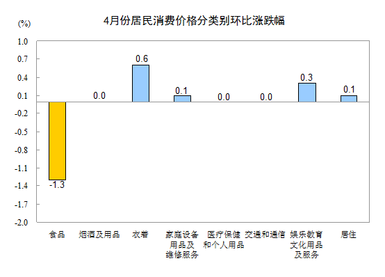 4月份,全國居民消費價格總水平環比下降0.3%。其中,城市下降0.3%,農村下降0.4%;食品價格下降1.3%,非食品價格上漲0.2%;消費品價格下降0.6%,服務價格上漲0.2%。