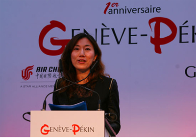 王凡總經理首先致辭,她代表國航對航線開通一年來各界朋友的大力支持表示誠摯的感謝,尤其是對日內瓦機場所給予的通力合作和理解信任深表謝意。她表示,該航線的開通架起了中瑞兩國的一座空中橋梁,促進了兩國人民的友好交往,推動了兩國政治、經濟、文化等各方面的交流。根據機場提供的最新信息,截至2014年5月份第一周,日內瓦-北京航線共承運5.3萬人次旅客,運輸進出港貨物5000噸。直航的開通使北京—日內瓦雙向流量同比增長55%,國航北京至日內瓦航線的旅客人數占到北京至日內瓦直達和中轉航班旅客總人數的一半以上,市場份額增長達到60%。她強調說,該航線的定位以品質高端為己任,偏重于商務需求,一年來營業部與國際奧委會、世衛組織等聯合國14個國際組織以及知名企業簽署了合作協議,作為國航在瑞士業務拓展的支柱,同時又將開發休閑旅游市場作為業務開展的基礎,與湖區旅游相結合推廣宣傳,極富成效。