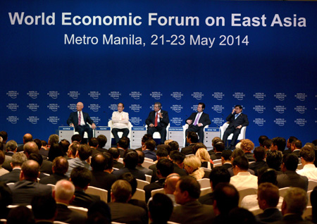 第23屆世界經濟論壇東亞峰會22日在菲律賓首都大馬尼拉地區的香格里拉酒店拉開帷幕,來自30個國家的600位政界與商業領袖出席會議,探討如何應對經濟不平等問題。 本次峰會的主題為“以增長促進公平進步”,與會代表將圍繞開拓就業渠道、推動可持續發展模式以及加強地區聯系三個議題進行研討。峰會將于23日閉幕。 圖為世界經濟論壇主席克勞斯·施瓦布、菲律賓總統阿基諾、印尼總統蘇西洛·班邦·尤多約諾、越南總理阮晉勇和緬甸副總統吳年吞參加22日的峰會(從左至右)。
