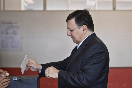 25日,歐盟委員會主席巴羅佐在里斯本一個投票站內投票。22日至25日,《里斯本條約》施行后首次歐洲議會選舉在歐盟28個成員國舉行,選舉結果將于全部成員國投票結束后,于布魯塞爾當地時間25日深夜公布。