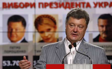 烏克蘭總統候選人波羅申科26日在基輔舉行新聞發布會。 烏克蘭總統選舉投票于當地時間25日20時結束。雖然烏克蘭大選的結果尚未公布,但多項出口民調顯示,波羅申科得票率超過50%,當地輿論普遍認為他已勝券在握。 波羅申科強調,落實歐盟聯系國協議的條款無疑將是對外政策的優先方向。他將盡全力使烏克蘭在1至2年內履行完上述協議規定的義務,為最終加入歐盟奠定基礎。有分析指出,波羅申科面臨的另一重任是如何將烏克蘭經濟拉回正軌。目前該國經濟已經陷入衰退,國際貨幣基金組織警告說,烏克蘭經濟今年可能萎縮5%。