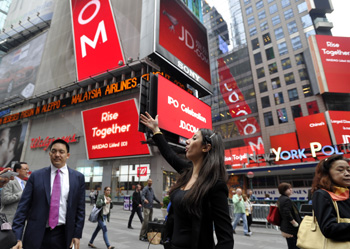 5月22日,行人在紐約曼哈頓經過發布京東上市信息的納斯達克交易所門前街道。當天,京東集團正式在美國納斯達克上市。 記者