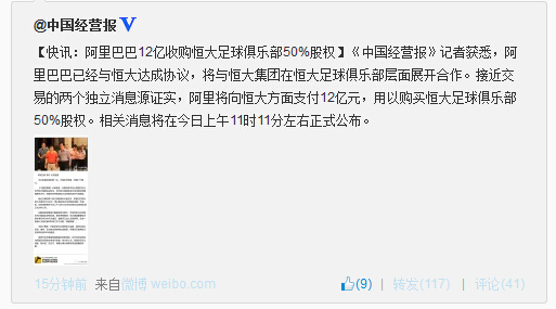 接近交易的兩個獨立消息源證實,阿里將向恒大方面支付12億元,用以購買恒大足球俱樂部50%股權。