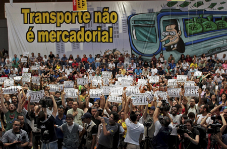 6月8日,地鐵工人在巴西圣保羅舉行示威。 當日,巴西一家地區勞動法院判決日前的地鐵罷工為“非法”,并向相關工會組織開出了50萬雷亞爾(約22.3萬美元)/天的高額罰款。2014年世界杯揭幕戰舉辦地、巴西最大城市圣保羅5日發生的地鐵罷工已經進入第五天,造成該市大面積交通擁堵!