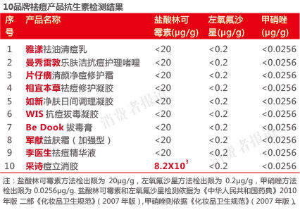 此次《消費者報道》送檢10品牌祛痘產品至第三方權威檢測機構,檢測指標包含了三種常見抗生素:鹽酸林可霉素、左氧氟沙星和甲硝唑。