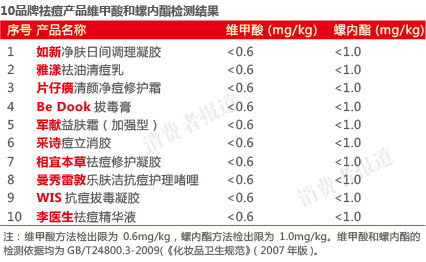 本刊此次就選擇了維甲酸和螺內酯進行檢測。據檢測結果顯示,10款產品兩物質含量均低于檢出限0.6mg/kg和1.0mg/kg。