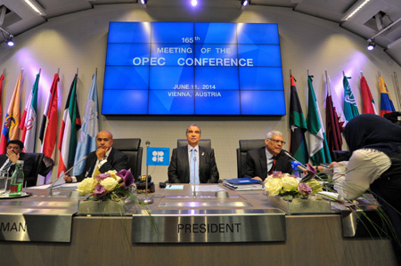 6月11日,石油輸出國組織(歐佩克)在位于奧地利維也納的總部召開第165次部長級會議,12個成員國代表出席。本次大會主席、利比亞石油和天然氣代理部長奧馬爾·沙克馬克(中)和歐佩克秘書長阿卜杜拉·巴德里(中右)出席會議。參加會議的沙特阿拉伯石油和礦產資源大臣納伊米10日曾預測,鑒于目前國際原油市場穩定,歐佩克將維持原油產量限額不變。由12個成員國組成的歐佩克,提供全球原油總產量的近三分之一,目前日產原油3000萬桶。