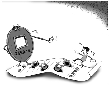 在北京,隆安律師事務所合伙人金作鵬稱,他所代理的數十起信托訴訟涉及多類“免責陷阱”:一是信息披露不到位,信托公司在網站發布凈值,代替實地寄送;二是利用復雜法律文書脫責,設法提高投資者問責、中止已虧損信托的條件;三是用產品說明書等取代合同協議!耙恍┳龇ㄒ茁裣码[患,甚至只給投資者合同封底,簽字后再寄送全文!