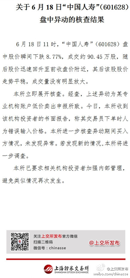 上交所官方微博“上交所發布”6月19日發布關于6月18日“中國人壽”(601628)盤中異動的核查結果,系機構交易員下單時人為錯誤輸入價格所致。