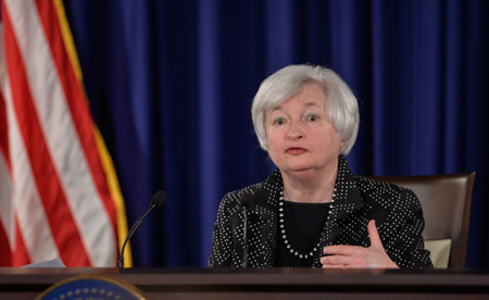 美國聯邦儲備委員會18日宣布,從7月起將月度資產購買規模從450億美元削減至350億美元,并承諾繼續保持貨幣政策寬松。同時,受第一季度嚴寒天氣影響,美聯儲將2014年美國經濟增長預期從此前的2.8%至3.0%下調為2.1%至2.3%。對明后兩年的增長前景保持樂觀,但是對長期前景表示擔憂。 圖為美聯儲主席耶倫當日出席在美國首都華盛頓召開的貨幣政策例會新聞發布會。
