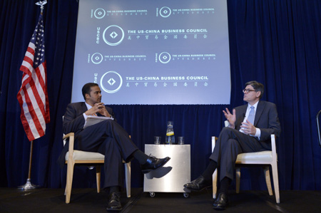 7月1日,在美國首都華盛頓,美國財政部長雅各布·盧(右)在美中貿易全國委員會舉辦的一場活動上講話。雅各布·盧表示,中國房地產存在泡沫風險,但是中國也具備多種抑制泡沫的工具,中國房地產市場不會威脅全球金融市場的穩定。