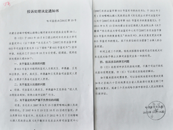 哈爾濱市司法局給果農們下達的對東北農業大學司法鑒定中心作出的投訴處理決定通知。