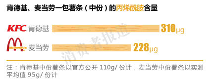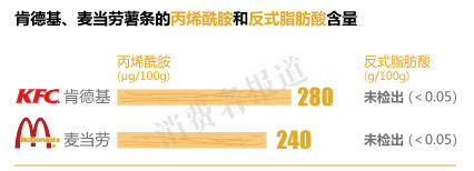 《消費者報道》此次送檢權威檢測機構的檢測結果顯示,肯德基和麥當勞薯條均未檢出反式脂肪酸(檢出限0.05g/100g),但均含有丙烯酰胺,其中肯德基為280μg/100g,麥當勞為240μg/100g。