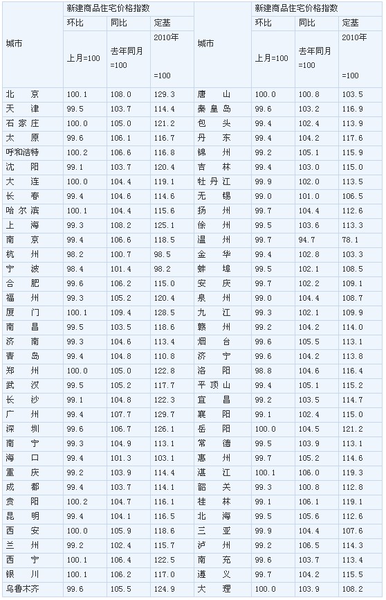 。ㄒ唬┡c上月相比,70個大中城市中,價格下降的城市有52個,持平的城市有11個,上漲的城市有7個。環比價格變動中,最高漲幅為0.1%,最低為下降1.5%。