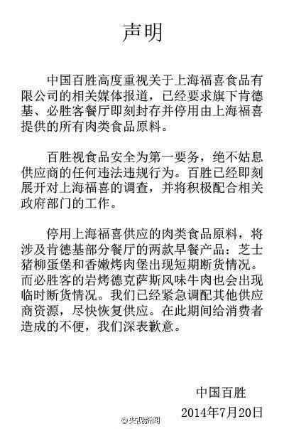 央視新聞【百勝集團回應:封存停用涉事原料】針對供應商提供問題原料被曝光一事,肯德基、必勝客所屬的百勝餐飲集團回應:即刻封存并停用由上海福喜提供的所有肉類食品原料。因停用上海福喜供應原料造成三款產品出現臨時斷貨,已緊急調配其他供應商資源。