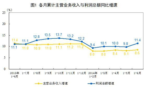 2014年1-6月份全國規模以上工業企業利潤總額同比增長11.4%