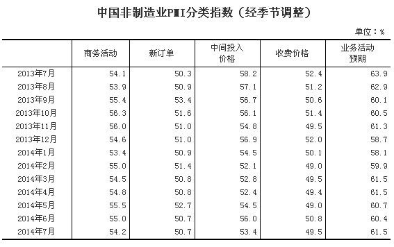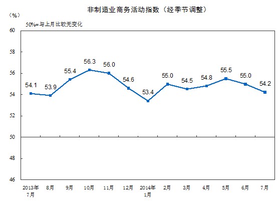 2014年7月,中國非制造業商務活動指數為54.2%,雖比上月回落0.8個百分點,但仍高于榮枯線4.2個百分點。