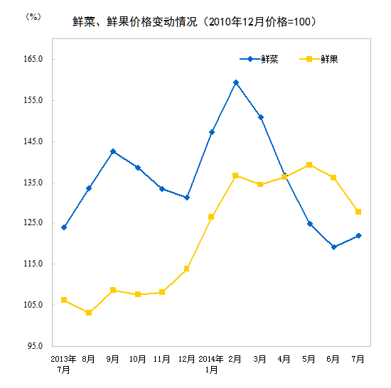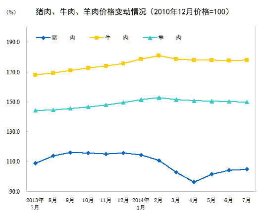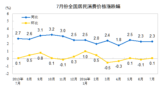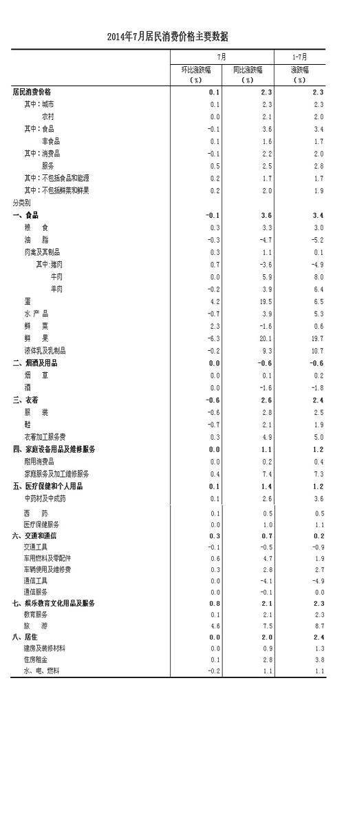 2014年7月份,全國居民消費價格總水平同比上漲2.3%。其中,城市上漲2.3%,農村上漲2.1%;食品價格上漲3.6%,非食品價格上漲1.6%;消費品價格上漲2.2%,服務價格上漲2.5%。1-7月平均,全國居民消費價格總水平比去年同期上漲2.3%。