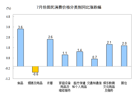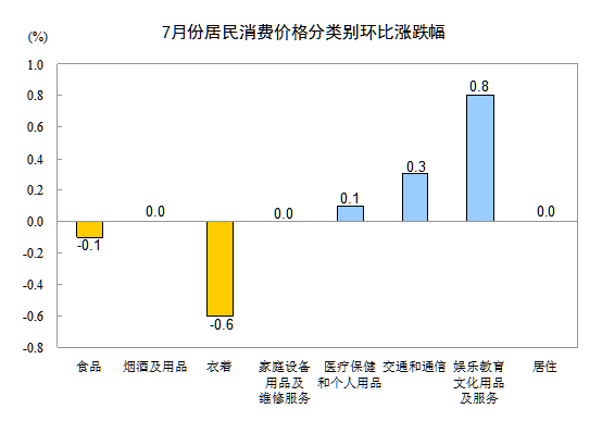 7月份,非食品價格環比上漲0.1%。其中,娛樂教育文化用品及服務、交通和通信、醫療保健和個人用品價格分別上漲0.8%、0.3%和0.1%;煙酒及用品、家庭設備用品及維修服務、居住價格均持平;衣著價格下降0.6%。
