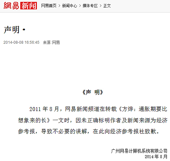 網易在致歉聲明中稱:“2011年8月,網易新聞頻道在轉載《方燁:通脹期要比想象來的長》一文時,因未正確標明作者及新聞來源為經濟參考報,導致不必要的誤解,在此向經濟參考報社致歉!