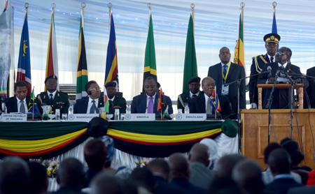 第34屆南部非洲發展共同體(南共體)首腦峰會于17至18日在津巴布韋維多利亞瀑布城舉行,主題為南共體經濟轉型策略。非洲自由貿易區的談判進程是備受矚目的議題。南共體執行秘書斯特格米娜·塔克斯表示,非洲自由貿易區可能比計劃提前一年即在2015年建立。這一大自貿區建成后將覆蓋東南非共同市場、東非共同體和南共體共26個成員國,惠及非洲大陸6億人口,國內生產總值總計約1萬億美元。 圖為17日津巴布韋總統穆加貝(前右一)在南部非洲發展共同體峰會上發言。