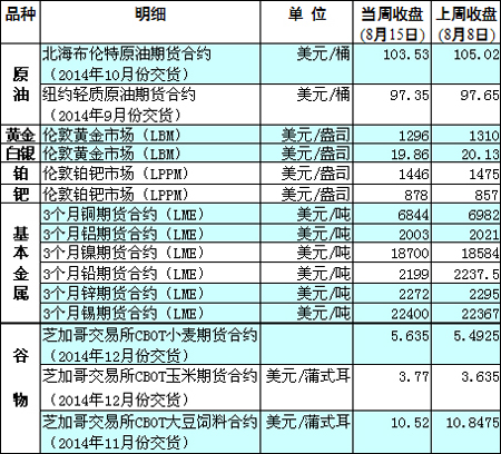 國際大宗商品期貨價格明細表[2014-8-18]