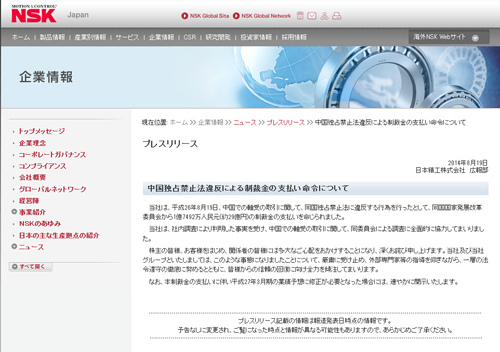 日本精工株式會社就因違反中國反壟斷法受罰發出的企業公告