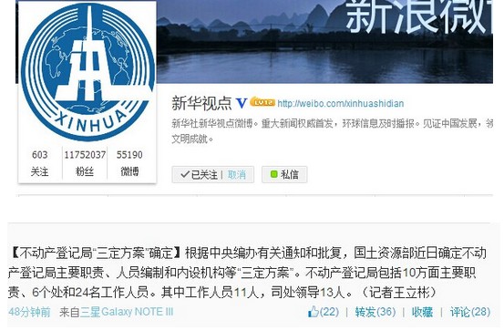 據新華視點微博20日消息,根據中央編辦有關通知和批復,國土資源部近日確定不動產登記局主要職責、人員編制和內設機構等“三定方案”。不動產登記局包括10方面主要職責、6個處和24名工作人員。其中工作人員11人,司處領導13人。