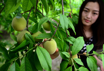 | 隴南市武都區,一名科技人員正在查看“水果村”里的水果長勢 |