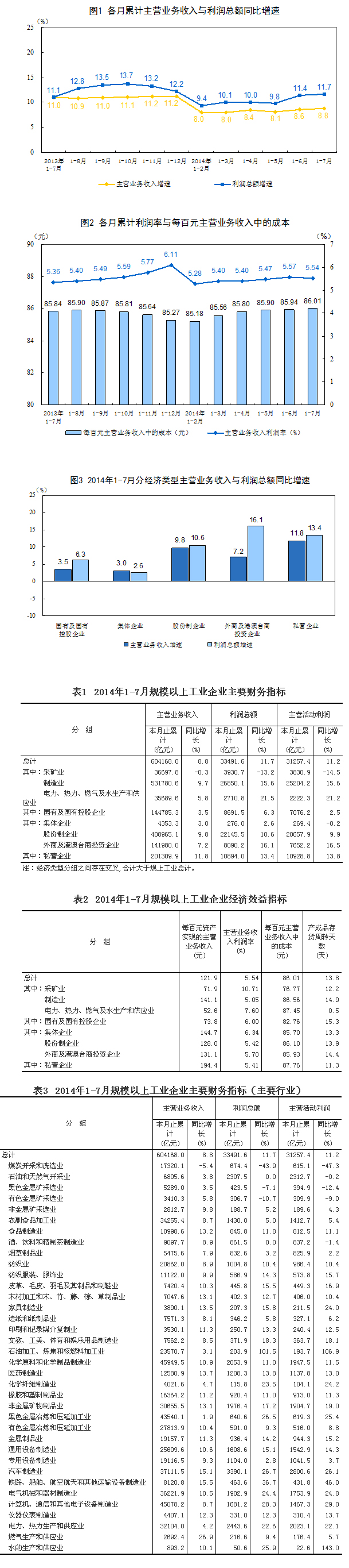 何平指出,1-7月份工業利潤保持平穩較快增長的主要原因,一是隨著國家一系列“穩增長”政策的實施,企業銷售保持穩定增長。1-7月份,規模以上工業企業主營業務收入同比增長8.8%,增速比上半年提高0.2個百分點。二是成本費用上升勢頭有所抑制。1-7月份,企業主營業務成本同比增長9%,增速與上半年持平;每百元主營業務收入中的成本為86.01元,同比增加0.22元,比上半年少增加0.14元。每百元主營業務收入中的期間費用合計為7.14元,為今年以來最低水平,同比增加0.11元,比上半年少增加0.03元。三是主要原材料等上游產品價格持續回落,為中下游企業創造了盈利空間。四是新增利潤依賴于少數行業的現象有所緩解。1-7月份,汽車制造業、電力熱力生產和供應業等新增利潤較多的前5個行業新增利潤合計占全部規模以上工業企業新增利潤的比重為62.5%,比上半年下降4.2個百分點。同時,利潤下降最多的煤炭開采和洗選業對全部企業利潤增長的負拉動作用也比上半年有所減弱。