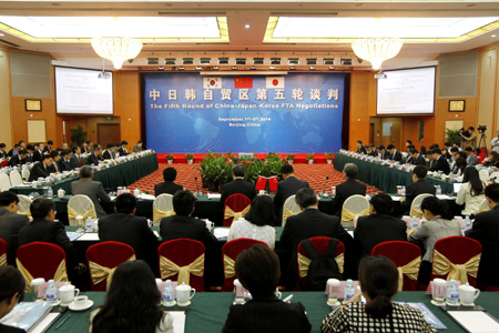 9月1日,中日韓自貿區第五輪談判在北京舉行。中國商務部部長助理王受文、日本外務省副部級審議官長嶺安政和韓國產業通商資源部部長助理禹泰熙率團與會。本輪談判將持續5天,三方主要就貨物貿易的降稅模式、服務貿易和投資的開放等議題展開磋商,并就協定的范圍和領域交換意見。