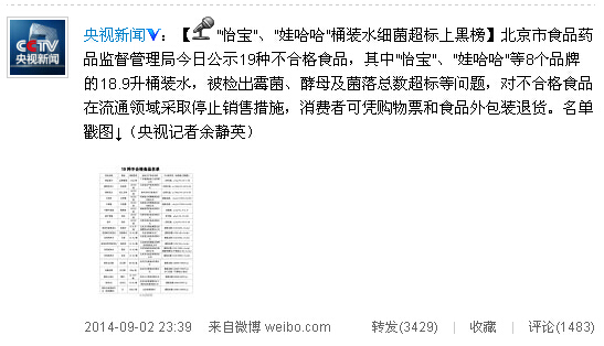 【"怡寶"、"娃哈哈"桶裝水細菌超標上黑榜】北京市食品藥品監督管理局今日公示19種不合格食品,其中"怡寶"、"娃哈哈"等8個品牌的18.9升桶裝水,被檢出霉菌、酵母及菌落總數超標等問題,對不合格食品在流通領域采取停止銷售措施,消費者可憑購物票和食品外包裝退貨。(央視記者余靜英)
