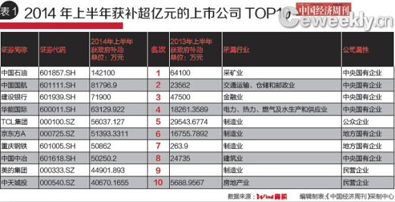 不過令人意外的是,另一家石油巨頭中國石化(600028.SH)則在這項統計中顯示沒有收到政府補助。記者查閱中國石化2014年半年報發現,今年上半年收到了政府7.9億元的補助,不過此項補助并未計入損益,即沒有計入凈利潤中。