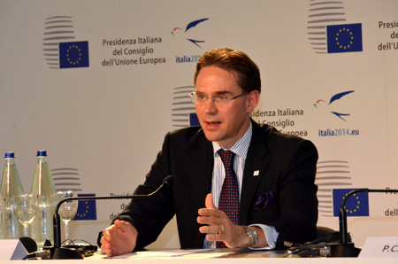 9月13日,在意大利米蘭,歐盟委員會負責經濟與貨幣事務委員卡泰寧出席新聞發布會。 當日,歐盟輪值主席國意大利的經濟部長帕多安在米蘭歐盟財政部長非正式會議結束時說,促進歐洲經濟增長需要更多投資,尤其需要私人投資以及發揮催化劑作用的公共投資,為此需要創造盈利條件,特別是通過結構性改革為投資解凍。