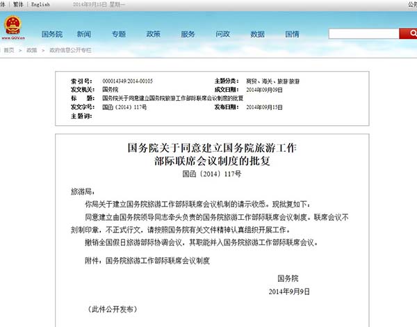 9月15日晚,中國政府網公布《國務院關于同意建立國務院旅游工作部際聯席會議制度的批復》(下稱《批復》):“同意建立由國務院領導同志牽頭負責的國務院旅游工作部際聯席會議制度。聯席會議不刻制印章,不正式行文,請按照國務院有關文件精神認真組織開展工作!