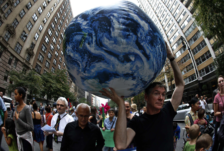 當地時間21日,美國紐約民眾舉行大游行,呼吁關注氣候變化。當天的游行是紐約“氣候周”活動的一部分,也是為了呼應將于23日在紐約舉行的聯合國氣候峰會。據主辦方統計,當天參與游行人數超過30萬。 圖為一名男子帶著地球模型參加游行。