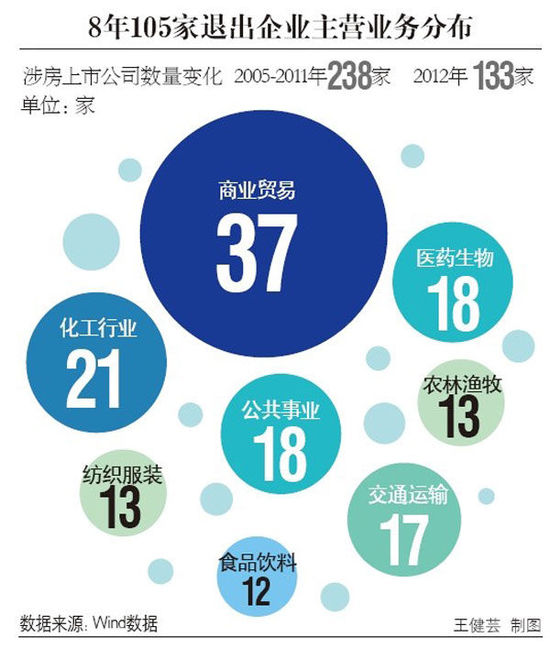 家,而到了2012年年報中,這一數值降到了133家,也即8年間,有105家,約44.1%的涉房上市企業選擇了“脫離房地產”。