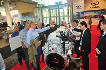 漢諾威車展上,觀眾正在參觀華菱汽車CM6D28發動機。 陳會松