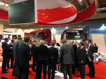 2010年,華菱第二次參展。這一次,華菱也帶去了兩臺展品,是剛剛推向市場的第二代新產品星凱馬,分別是一臺牽引車和一臺自卸車,裝配的是歐四發動機,主駕采用安全氣囊以及氣囊懸掛系統。這兩款車型的駕駛室布局都具有歐洲風格,其中一款區別于國內的帶臥鋪格局,是一排座椅,無臥鋪,更適合歐洲用戶的駕駛習慣。