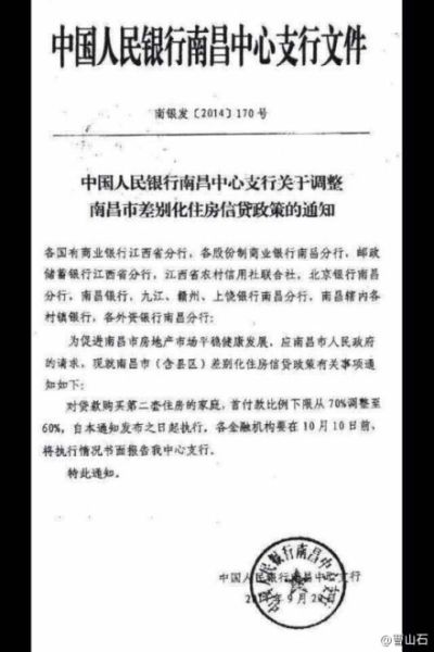 中國人民銀行南昌中心支行9月29日發布文件,進一步支持放松房貸。二套房首付從70%降到60%,即日起實施。這是首個央行省會支行發文明確放松限貸。