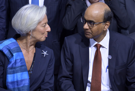 第30屆國際貨幣與金融委員會部長級會議11日在華盛頓召開。作為國際貨幣基金組織(IMF)的決策機構,國際貨幣與金融委員會(IMFC)警告全球經濟下行風險上升,敦促各國加快結構改革和提高潛在經濟增長率,促進全球經濟更加強勁、可持續和平衡增長。 圖為國際貨幣與金融委員會主席、新加坡副總理兼財政部長尚達曼(右)和國際貨幣基金組織總裁拉加德在會議前交談。