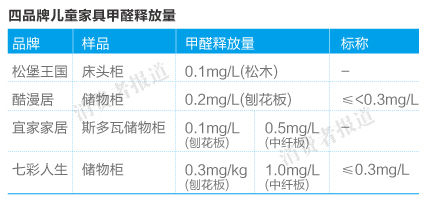 《消費者報道》自2014年8月始,陸續向具有權威資質的第三方檢測機構送檢七彩人生、酷漫居、宜家和松堡王國4個主流品牌旗下兒童家具,進行“重金屬含量”等指標的對比測試。令人稍感欣慰的是,在送檢的4品牌旗下的兒童儲物柜、兒童桌中,無一檢測出鉛、汞、銻、鉻等8種可遷移性重金屬。而在“甲醛釋放量”上,送檢的4品牌產品均低于新國標中規定的1.5mg/L限值要求。