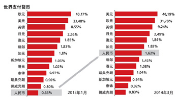 環球同業銀行金融電訊協會(SWIFT)數據顯示,人民幣繼美國之后在2013年12月取代了歐元,成為全球貿易金融中使用率第二高的貨幣。另外,人民幣已經躍升為第七大國際支付貨幣。星展銀行經濟學家周洪禮表示,隨著境外普及率的不斷提高,人民幣國際化機制正逐漸成形。盡管人民幣并未達到基本可兌換的地位,但很多國家的央行已經開始將人民幣納入該國的官方外幣資金。