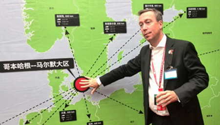 由瑞典、丹麥兩國組成的哥本哈根-馬爾默大區商務代表團14日在深圳推介營商環境,招徠中國企業前往投資。位于大區中的哥本哈根-馬爾默港是本次推介活動的重點項目。憑借輻射歐洲的戰略位置、優越的物流交通樞紐地位,以及潛力巨大的工業園區,這個綜合性綠色港口希望與中國企業深度合作,實現“雙贏”。圖為哥本哈根-馬爾默港總裁約翰·瑞斯汀介紹港口環境。
