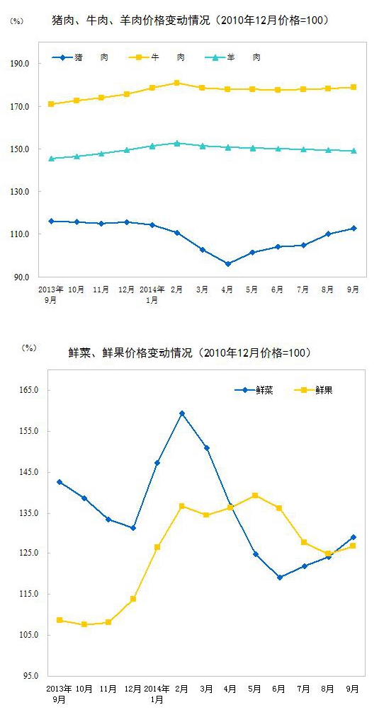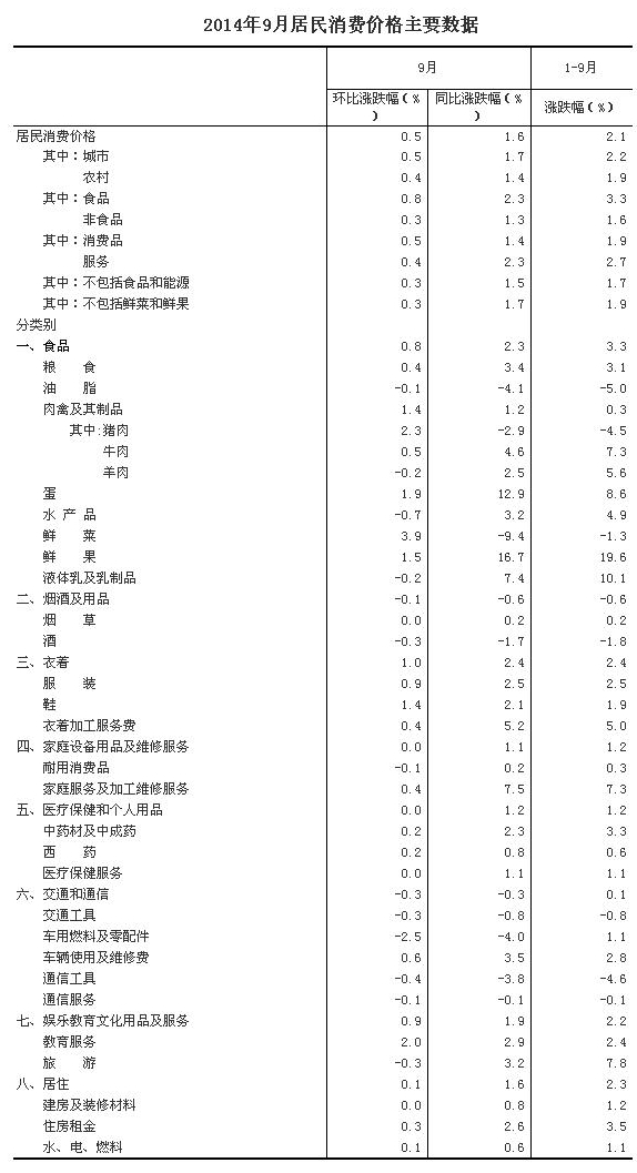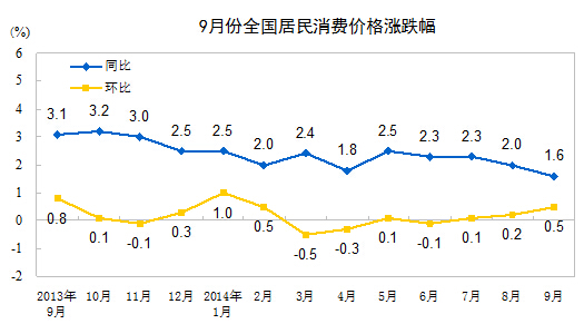 統計局15日發布數據顯示,2014年9月份,全國居民消費價格總水平同比上漲1.6%。其中,城市上漲1.7%,農村上漲1.4%;食品價格上漲2.3%,非食品價格上漲1.3%;消費品價格上漲1.4%,服務價格上漲2.3%。1-9月平均,全國居民消費價格總水平比去年同期上漲2.1%。