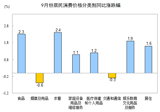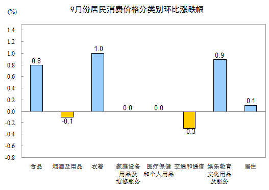 9月份,非食品價格環比上漲0.3%。其中,衣著、娛樂教育文化用品及服務、居住價格分別上漲1.0%、0.9%和0.1%;家庭設備用品及維修服務、醫療保健和個人用品價格持平(漲跌幅度為0);交通和通信、煙酒及用品價格分別下降0.3%和0.1%。