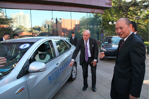 圖3:江淮汽車獨家贊助了“2014第三次工業革命高峰論壇”,并在論壇期間舉行了純電動轎車試乘試駕活動。圖為安徽江淮汽車股份有限公司總經理項興初(右一)在新華社現場,向美國著名趨勢學家里夫金先生介紹論壇專用的江淮愛意為(iEV)純電動轎車。王皓然/攝 |