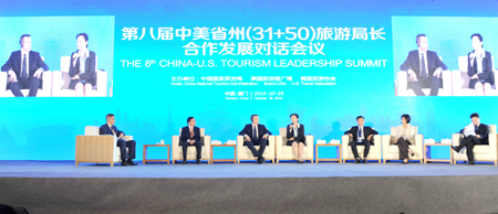 10月28日,由中國國家旅游局、美國旅游推廣局及美國旅游行業協會主辦的第八屆中美省州(31+50)旅游局長合作發展對話會議在福建廈門舉行。來自中美省州旅游主管部門、主要旅行商代表共150余人參加會議。國家旅游局局長邵琪偉表示,這一對話會議機制建立8年來,中美旅游往來規?偭客黄2200萬人次,年均增幅7.6%,其中中國游客赴美年均增長18.4%,美國游客來華年均增長1.6%。據美國商務部統計,2013年中國游客在美人均消費達5414美元,總消費達98億美元,占美對華服務貿易出口總額近30%。