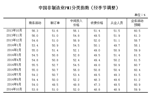 2014年10月,中國非制造業商務活動指數為53.8%,比上月回落0.2個百分點,高于榮枯線3.8個百分點,表明我國非制造業繼續保持擴張態勢。