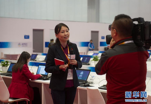 11月4日,國家會議中心新聞中心綜合服務臺的工作人員在提供咨詢服務。當日,2014年亞太經合組織(APEC)領導人會議周兩個新聞中心之一的國家會議中心新聞中心正式啟用向媒體記者開放。據介紹,新聞中心總面積約11000平方米,全面覆蓋免費無線網絡,將為媒體提供視頻、文字、圖片綜合素材和專業的廣播電視服務。新華社記者 陳曄華/攝